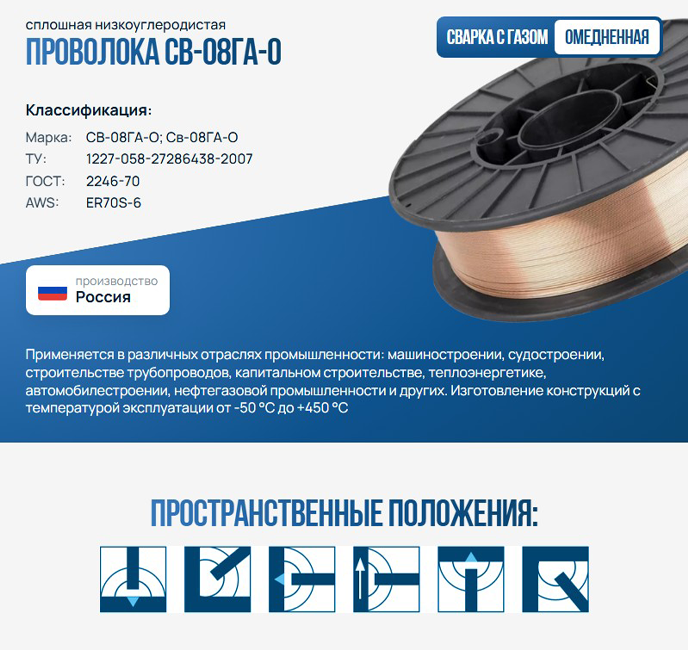 Омеднённая сварочная проволока Св-08Г2С-О предназначена для полуавтоматической сварки низкоуглеродистых и низколегированных сталей в среде защитного газа и газовой смеси. Обеспечивает стабильную подачу, устойчивое горение дуги и минимальное разбрызгивание.